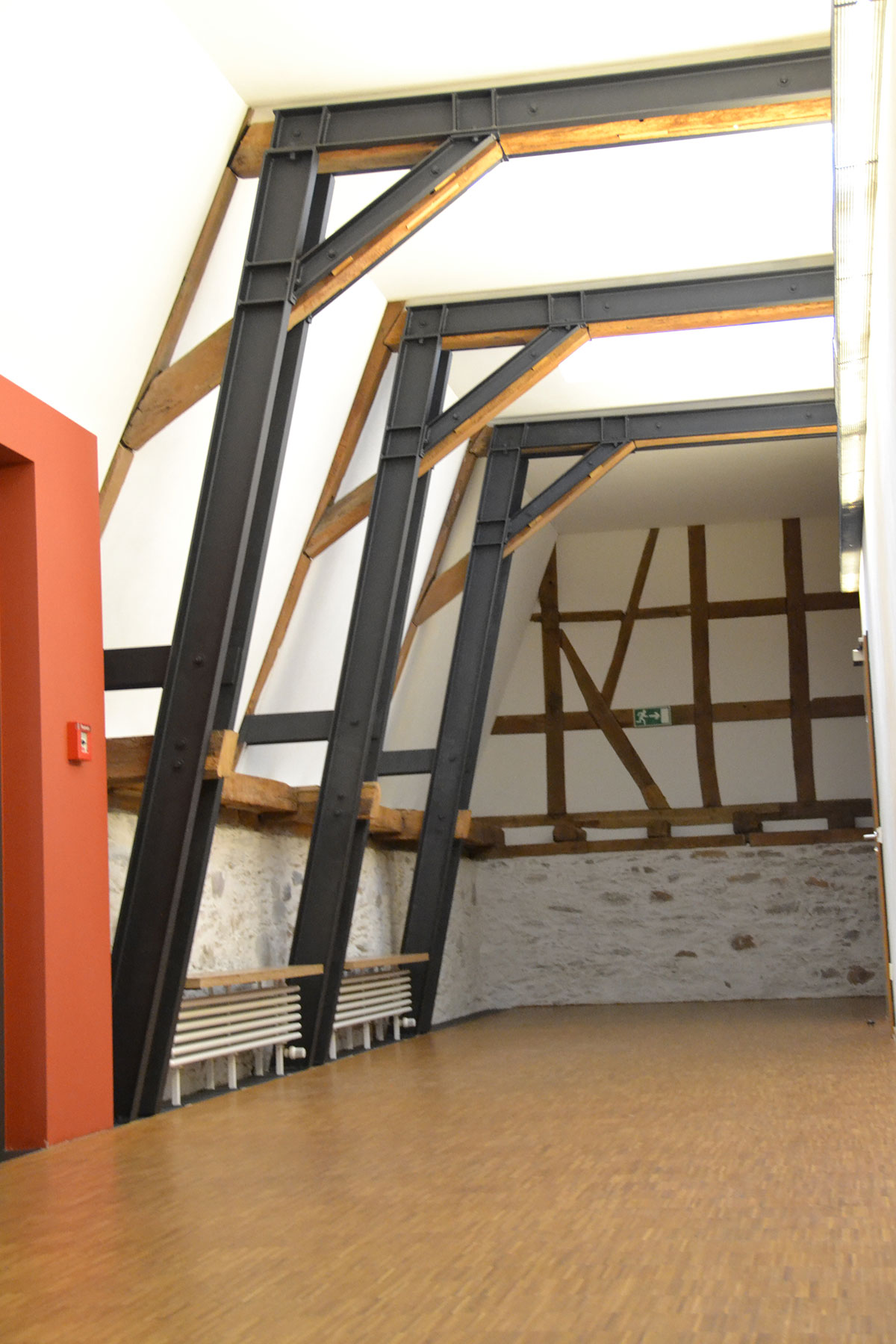 Das Obergeschoss bietet auf einer Fläche von 260 qm reichlich Platz für die Kinder- und Jugendarbeit der Gemeinde. Durch den roten Mauerdurchbruch zur Rechten betreten wir den Altbau. Wir befinden uns jetzt im alten Heuschober. Die zwei Türen vor uns führen in einen großen Mehrzweckraum, in dem Gruppenarbeit ebenso möglich ist wie das Veranstalten von Seminaren, Feiern oder – dank des federnden Bodenaufbaus – Gymnastik.