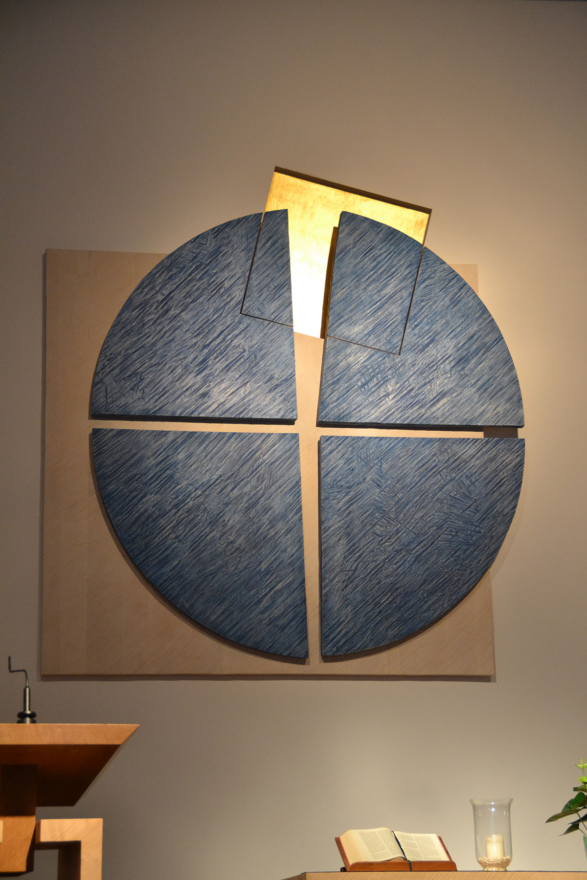 Der Aufbau des Kunstwerkes lässt drei Ebenen erkennen, die hintereinander angeordnet dem Werk eine perspektivische Wirkung verleihen. Auf der Wand ist zunächst ein Quadrat aus hellem Holz aufgebracht, licht und rein, ein biblisches Bild für Gottes vollkommene Schöpfung: „Siehe, es war alles gut.“ (1. Mose 1,31) Durch den Sündenfall hat der Mensch allerdings sein Recht verwirkt, dort zu leben. Gott hat ihm die Erde (dargestellt durch den blauen Kreis) zur Verfügung gestellt, doch längst hat sich der „blaue Planet“ von Gott gelöst und in den Vordergrund gespielt. Tiefe Einschnitte im Holz, hergestellt mit einer Kettensäge, stehen für die Verletzungen und Schäden, die Menschen einander und der Schöpfung antun.